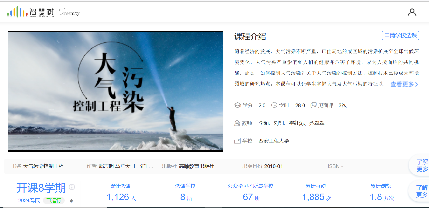 《大氣污染控制工程》是環(huán)境工程專業(yè)的一門專業(yè)核心課,系統(tǒng)地闡述了大氣污染的基本理論、各種控制方法的過(guò)程分析及典型控制設(shè)備的工藝設(shè)計(jì)計(jì)算。課程自1985年開設(shè),經(jīng)過(guò)四十多年的建設(shè)與創(chuàng)新,構(gòu)建基于全過(guò)程控制理念的大氣污染控制教學(xué)內(nèi)容體系,與時(shí)俱進(jìn)、傳承發(fā)展,形成鮮明特色。該課程2019年被評(píng)為校級(jí)精品資源共享課程,在團(tuán)隊(duì)成員劉釗、崔紅濤、蘇翠翠的共同努力下,在智慧樹平臺(tái)建成線上慕課。