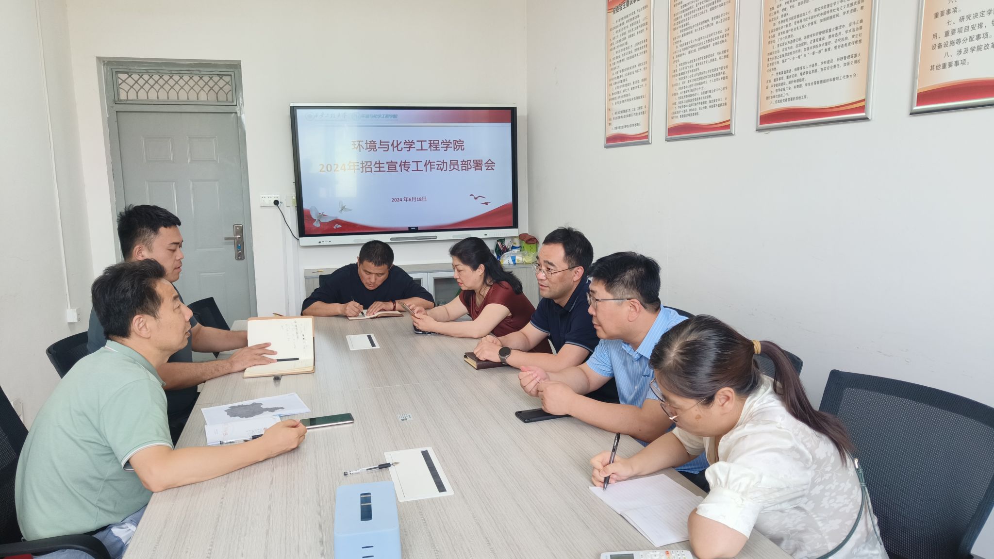 會(huì)上,賈天昱傳達(dá)了2024年我校招生宣傳工作推進(jìn)會(huì)相關(guān)情況,介紹下一階段學(xué)院具體工作安排和工作重點(diǎn)。胡西民充分肯定了學(xué)院2024年高考招生宣傳前期各項(xiàng)籌備工作,并代表學(xué)院向所有參與招生宣傳工作的教師表示感謝。胡西民表示,高考招生宣傳工作事關(guān)考生和家長(zhǎng)切身利益,事關(guān)學(xué)校各項(xiàng)事業(yè)高質(zhì)量發(fā)展,事關(guān)高等教育人才培養(yǎng)和民族未來(lái),意義重大,使命光榮,學(xué)院教師主動(dòng)犧牲休息時(shí)間,冒酷暑、頂烈日,不辭辛勞的為學(xué)校招生工作奔走,體現(xiàn)了我院教師顧大局、識(shí)大體、講奉獻(xiàn)的優(yōu)秀品格。他強(qiáng)調(diào),各支招生宣傳小分隊(duì)要嚴(yán)格按照既定的工作安排,在確保安全的前提下,細(xì)致嚴(yán)謹(jǐn)?shù)淖ズ酶鞯貐^(qū)招生咨詢工作,遵守工作紀(jì)律,恪守教師行為規(guī)范,圓滿完成學(xué)院2024年招生宣傳工作各項(xiàng)任務(wù)。