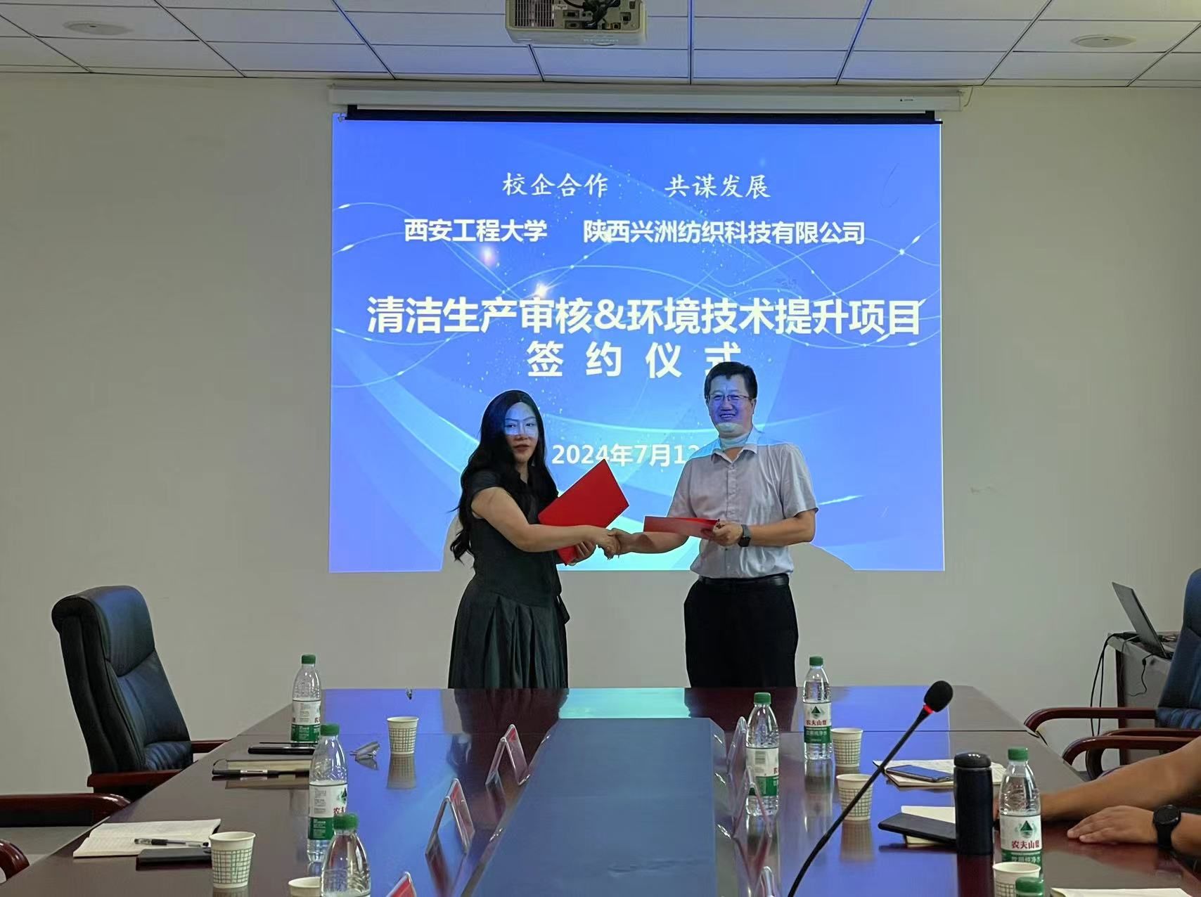 緊接著,環(huán)化學(xué)院院長武占省與陜西興洲紡織科技有限公司總經(jīng)理楊軒分別代表雙方簽署《西安工程大學(xué)與陜西興洲紡織科技有限公司“清潔生產(chǎn)審核&環(huán)境技術(shù)提升”項目合同》。