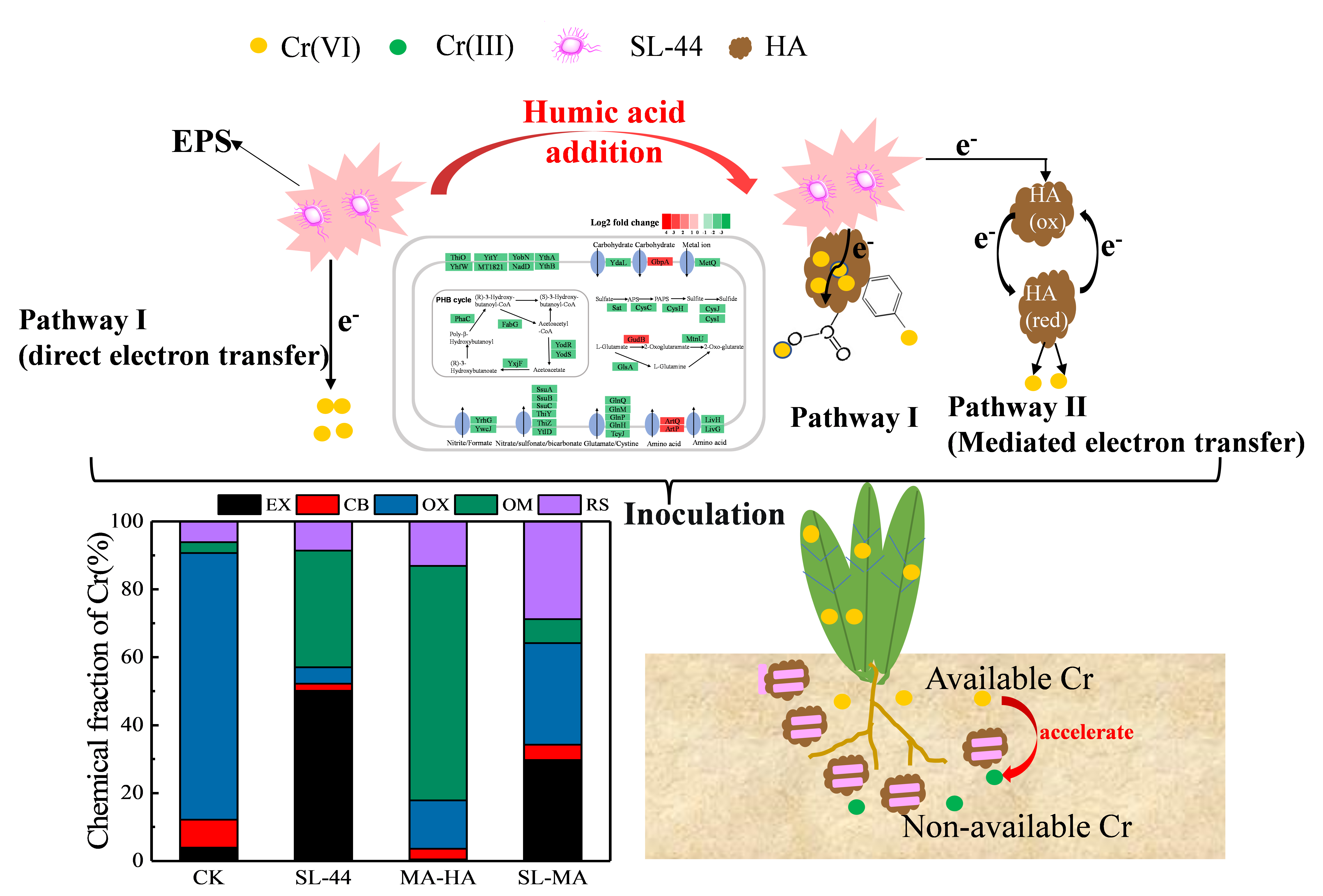 枯草芽孢桿菌具有優(yōu)良的抗逆性,其不僅可以促進(jìn)植物生長(zhǎng)、抑制土壤病菌生長(zhǎng),還可以改善土壤結(jié)構(gòu),還常被用作修復(fù)劑來(lái)降低水和土壤中重金屬的移動(dòng)性和植物有效性。但由于Cr(VI)對(duì)微生物生理活性、遺傳物質(zhì)穩(wěn)定性的危害,需要對(duì)細(xì)菌加入特定的保護(hù)劑。腐殖酸作為一種生物相容性良好的多官能團(tuán)有機(jī)大分子,其可以作為微生物保護(hù)劑和重金屬離子螯合劑。因此,為了解析腐殖酸保護(hù)劑在枯草芽孢桿菌SL-44還原鉻過(guò)程中所扮演的角色,本研究通過(guò)經(jīng)驗(yàn)擬一階動(dòng)力學(xué)、對(duì)數(shù)變換的紫外-可見(jiàn)差分吸收光譜、激發(fā)發(fā)射熒光光譜耦合平行因子分析兩種腐殖酸(AL-HA和MA-HA)對(duì)Cr(VI)的非生物還原、金屬絡(luò)合容量。闡明了MA-HA展示出較高的還原速率常數(shù)和絡(luò)合穩(wěn)定常數(shù),MA-HA更高的電子交換容量(EEC)可以增強(qiáng)細(xì)菌-腐殖酸復(fù)合物(SL-MA)的電容并降低電化學(xué)阻抗,以推動(dòng)中價(jià)態(tài)Cr(V)的生成并增強(qiáng)Cr(VI)還原率。揭示了MA-HA可緩解Cr(VI)對(duì)SL-44的生理毒性,展示出細(xì)菌胞外分泌物中谷胱甘肽含量的顯著降低以及涉及氨基酸轉(zhuǎn)運(yùn)蛋白、谷氨酸代謝、多羥基丁酸(PHB)水解相關(guān)基因的下調(diào)。腐殖酸協(xié)同枯草芽孢桿菌劑應(yīng)用能使白菜中鉻富集量顯著降低71.0%。