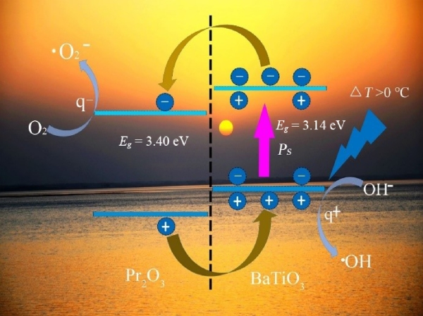 紡織印染行業(yè)是工業(yè)廢水的排放大戶。印染廢水是工業(yè)廢水的主要來源之一。目前,催化方法被認(rèn)為是一種有效的紡織印染廢水處理方法,已經(jīng)在降解污染物上取得較大進(jìn)展,常見的綠色清潔催化方式主要是光催化。除了光,冷熱變換(例如晝夜溫差)熱能,也是一種可以加以利用的清潔能源。在環(huán)境冷熱變換下,熱釋電材料表面可以誘導(dǎo)出正負(fù)電荷,并進(jìn)一步在溶液中產(chǎn)生各種活性自由基(例如超氧自由基和羥基自由基)。類比于光催化的定義,這種效應(yīng)可以稱為熱釋電催化。該領(lǐng)域研究目前在國際上剛興起,相關(guān)研究報(bào)道較少。