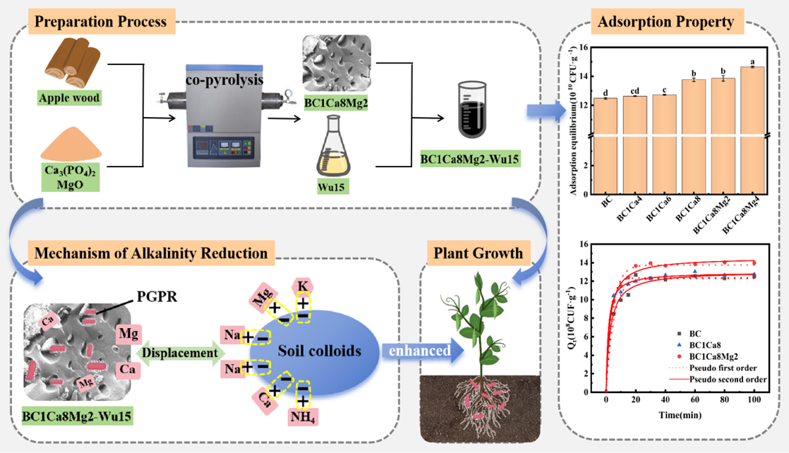 土壤鹽漬化已成為阻礙農(nóng)業(yè)生產(chǎn)發(fā)展和提高土地利用效率的關(guān)鍵因素。目前,生物措施被認為是一種有效的改良鹽堿地的方法。例如在土壤中施加植物根際促生菌(PGPR)可以很大程度上緩解高鹽濃度對植物的毒害作用,提高植物抗鹽脅迫的能力。研究表明生物炭基菌劑對植物生長也有顯著的促進作用,但由于原始生物炭缺乏或存在少量的金屬陽離子,不能將鹽堿土中的Na+完全置換,因此對鹽堿地的改良效果仍有待提高。本研究將蘋果木與Ca3(PO4)2和MgO共熱解,并負載霍氏腸桿菌Wu15,成功制備了改性生物炭基菌劑。結(jié)果表明,與對照組相比,BC1Ca8Mg2-Wu15中的土壤交換性鈉和電導(dǎo)率分別降低了53.6%和46.7%,土壤有機質(zhì)和有效磷分別提高了25.94%和13.85倍。此外,由于胞外聚合物的耐鹽性和改性生物炭基菌劑的離子交換性能,BC1Ca8Mg2-Wu15還顯著促進了豌豆的生長。本研究為改良鹽堿地和促進農(nóng)業(yè)可持續(xù)發(fā)展提供了一種有效的策略。