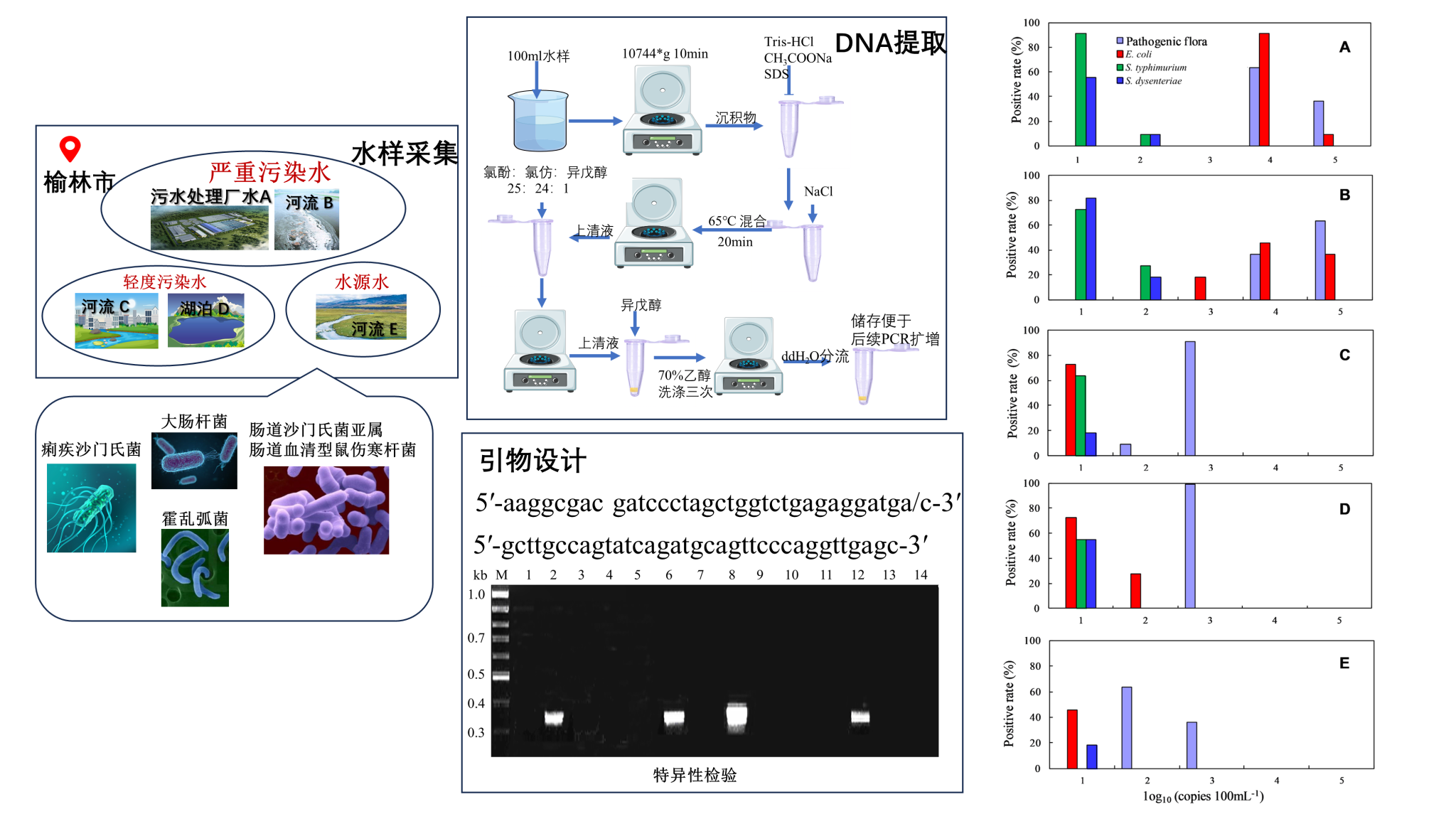 本研究建立了一種準(zhǔn)確、快速的定量PCR(qPCR)方法,可同時(shí)檢測(cè)水中4種病原菌(大腸桿菌、痢疾沙門氏菌、腸道沙門氏菌亞屬腸道血清型鼠傷寒桿菌、霍亂弧菌),并檢測(cè)出不同污染程度地表水中病原菌的分布情況(中國(guó)榆林地區(qū))。結(jié)果表明,該引物具有特異性,能夠準(zhǔn)確的檢測(cè)出水中四種病原菌,檢測(cè)準(zhǔn)確率為94%;病原菌細(xì)胞的檢測(cè)限為2.7。當(dāng)通用引物檢測(cè)病原菌豐度大于104copy·100 ml-1時(shí)腸道沙門氏菌亞屬腸道血清型鼠傷寒桿和痢疾沙門氏菌始終存在于水中。當(dāng)檢出值低于104copy·100 ml-1時(shí),水中幾乎沒(méi)有致病菌,因此104copy·100 ml-1可作為水中病原菌傳播污染的新指標(biāo)。