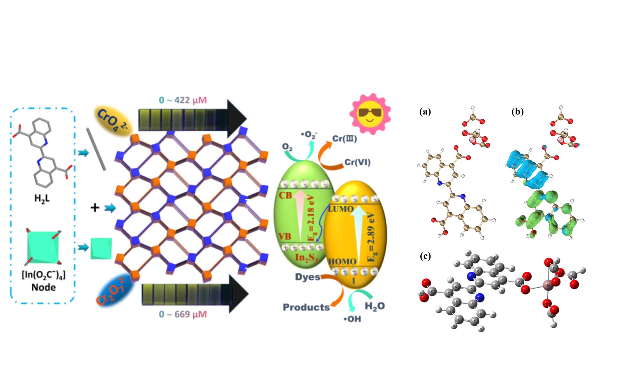 在國家自然科學基金委員會、陜西省科技廳等項目資助下,課題組取得了積極研究進展(Inorg. Chem.,2024, 66, 1816.中科院一區(qū),Top期刊,ESI高被引)。所設計新型In-MOF具有陰離子框架及光致發(fā)光效應,通道式空腔內修飾以喹啉N和羧基O原子。能夠對Cr(VI)和Cu2+離進行熒光淬滅傳感,具有可靠的選擇性和抗干擾性能,高檢測靈敏度及低檢出限。通過DFT和TD-DFT對基態(tài)和激發(fā)態(tài)進行建模,確定了LLCT的發(fā)光機制。負電性框架能夠快速及選擇性捕獲陽離子染料;在紫外光下對活性染料具有高效光催化降解能力。通過進一步構建S型異質結In2S3/In-MOF,在可見光下實現(xiàn)了印染加工用Cr(VI)及活性染料的高效光化學轉換及清除。該研究成果及其新發(fā)現(xiàn)為設計基于MOFs的新型多功能水處理藥劑,以解決一些棘手的環(huán)境問題,提供了可借鑒的實踐途徑與理論參考。本成果第一作者為我院21級碩士研究生尹歡雨,李慶與朱煒老師為通訊作者,西安工程大學為唯一通訊單位。