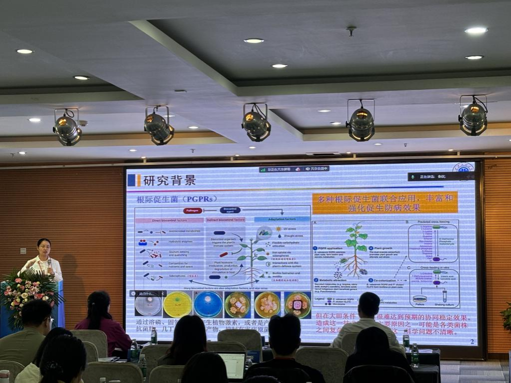 何艷慧副教授作了題為“枯草芽孢桿菌與陰溝腸桿菌互作誘導鐵載體合成及對植物生長研究”的報告,對課題組的混合菌劑互作體系及防病促生機制相關(guān)研究進展進行了分享。