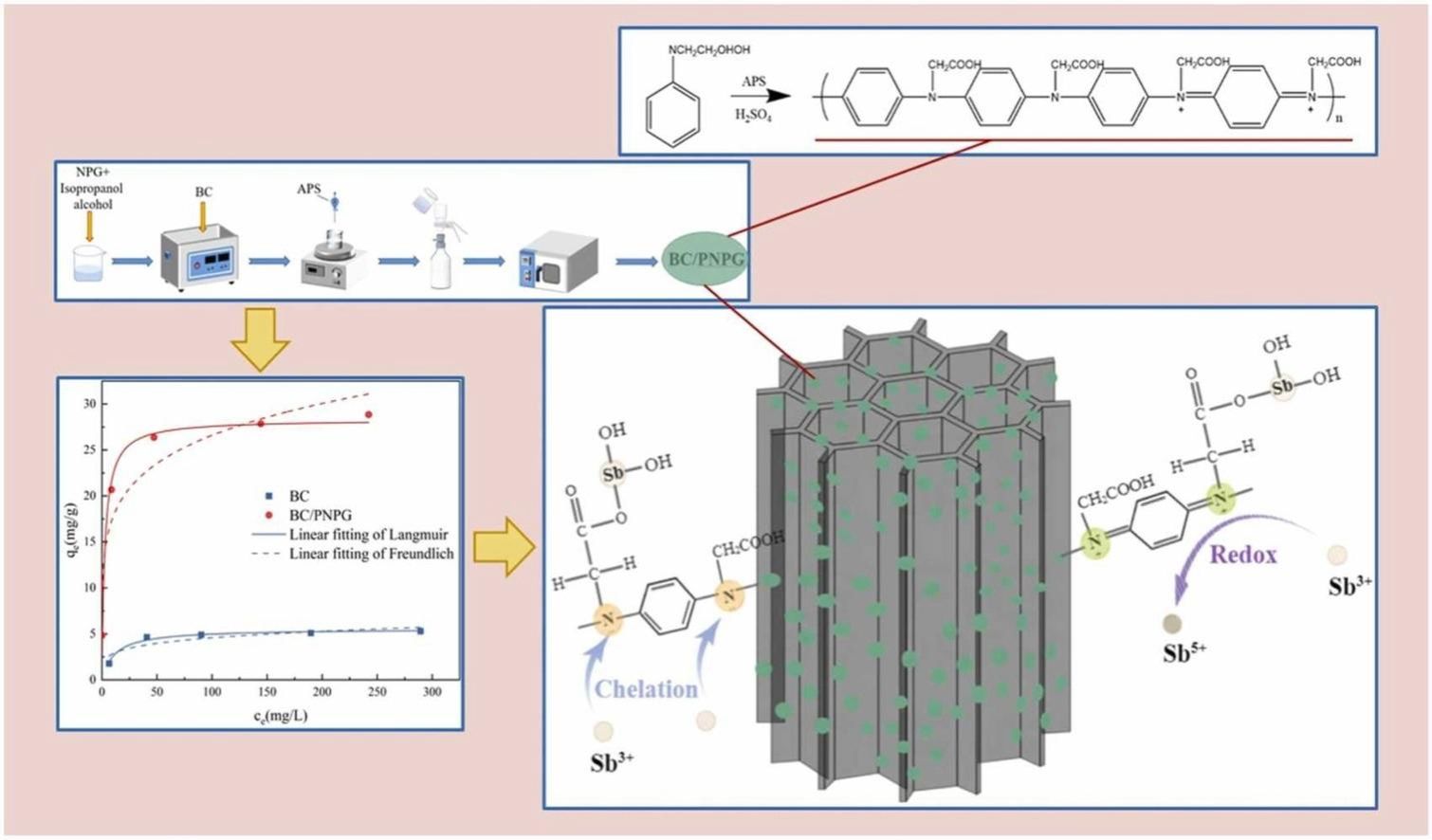 隨著化纖工業(yè)快速發(fā)展,含銻(Sb)催化劑的廣泛使用導(dǎo)致Sb污染物在印染前處理工藝(退漿和堿減量)流程中大量析出,隨廢水排放進(jìn)入水環(huán)境。Sb作為一種具有顯著生物毒性和潛在致癌性的重金屬,其在水體中的累積不僅嚴(yán)重威脅水環(huán)境安全和生態(tài)系統(tǒng)健康,更對(duì)我國(guó)紡織印染行業(yè)的綠色可持續(xù)發(fā)展構(gòu)成嚴(yán)峻挑戰(zhàn)。現(xiàn)有傳統(tǒng)污水處理工藝對(duì)Sb的去除效率低,難以滿足日益嚴(yán)格的排放標(biāo)準(zhǔn)。因此,開(kāi)發(fā)高效、低能耗、環(huán)境友好的的深度除銻技術(shù),并推動(dòng)其工程化應(yīng)用,已成為保障水環(huán)境安全、建設(shè)“美麗中國(guó)”的迫切需求。生物炭吸附法雖具有操作簡(jiǎn)便、資源節(jié)約等優(yōu)勢(shì),但原始材料吸附性能不足,嚴(yán)重制約其在印染廢水銻污染治理中的實(shí)際效能。
