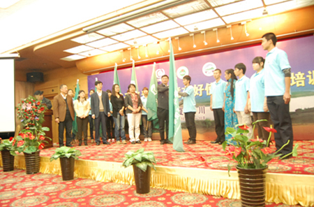 國(guó)家環(huán)保部以及寧夏環(huán)保廳有關(guān)領(lǐng)導(dǎo)、專(zhuān)家、項(xiàng)目辦人員以及首批青年環(huán)境友好使者百家綠色先鋒代表出席了開(kāi)幕式。我校學(xué)生李?lèi)偯妥鳛殛兾髑嗄晔拐叽砬f嚴(yán)地從寧夏環(huán)保廳領(lǐng)導(dǎo)的接過(guò)授旗,為環(huán)保許下最真的承諾。之后,各位專(zhuān)家老師們做了為期一天半的主題培訓(xùn)。其主要內(nèi)容為:神奇的地球、文明的反思、綠色的變革、如何進(jìn)行項(xiàng)目管理、經(jīng)驗(yàn)分享等。通過(guò)專(zhuān)家講座、播放錄像、案例分析、新老使者交流以及互動(dòng)游戲等方式,講解熱點(diǎn)環(huán)境問(wèn)題、環(huán)境知識(shí),樹(shù)立環(huán)境意識(shí),提高開(kāi)展再培訓(xùn)以及開(kāi)展環(huán)保活動(dòng)的技能。