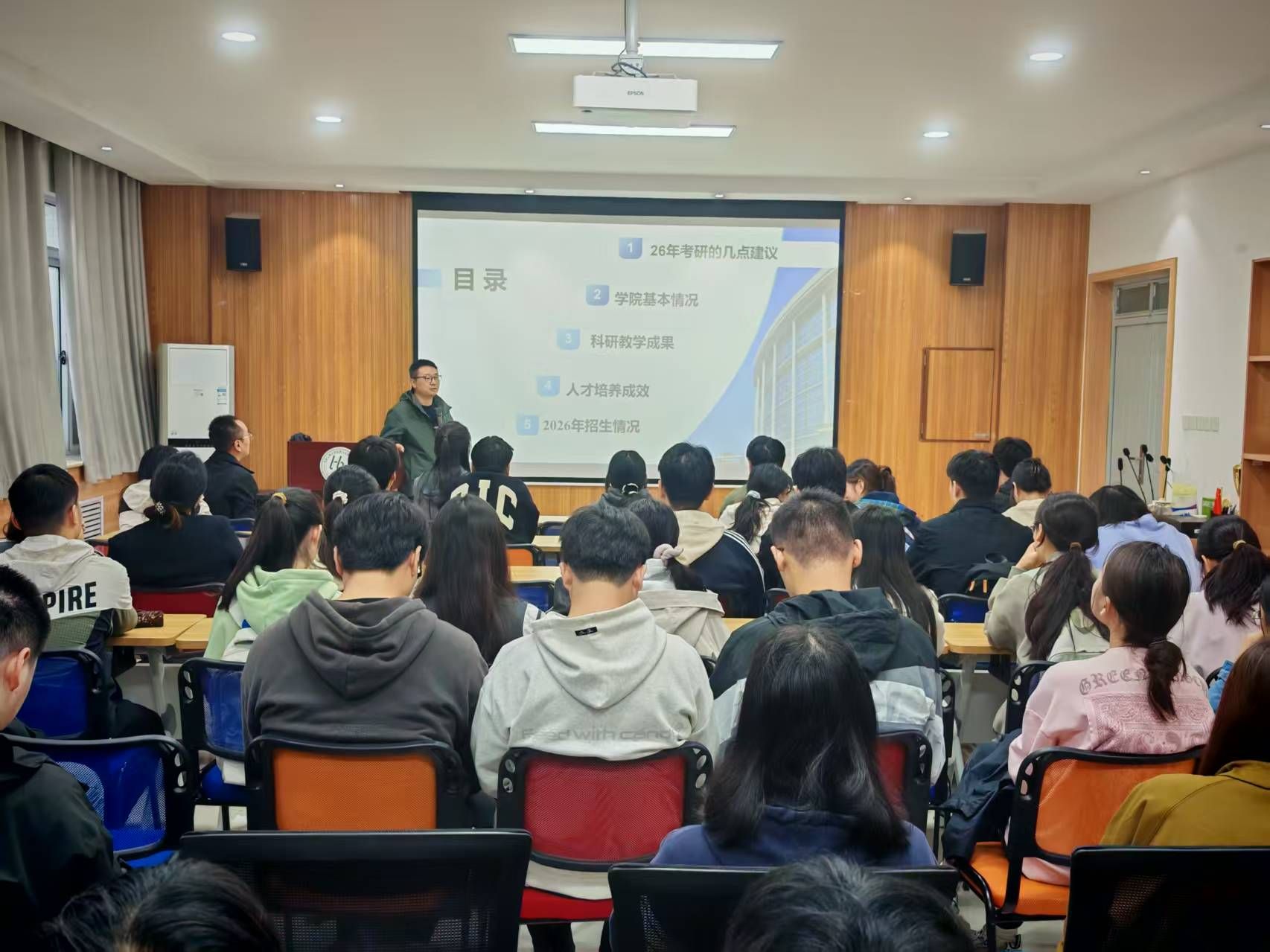 隨后,劉斌系統(tǒng)梳理了學(xué)術(shù)型碩士與專業(yè)型碩士在考試科目、報(bào)考情況、面試調(diào)劑、培養(yǎng)目標(biāo)、畢業(yè)要求等方面區(qū)別,為同學(xué)們提供了清晰的擇類指南。在備考策略方面,他提醒大家要“避免沖刺式學(xué)習(xí)”,摒棄“虛假努力”的自我感動(dòng),強(qiáng)調(diào)持之以恒和高效學(xué)習(xí)方法的重要性,并詳細(xì)指出了備考過程中的關(guān)鍵時(shí)間節(jié)點(diǎn),幫助同學(xué)們合理規(guī)劃復(fù)習(xí)進(jìn)度。最后,他介紹了學(xué)院的學(xué)科特色、師資力量及研究生招生政策進(jìn)行了宣講,鼓勵(lì)符合條件的同學(xué)積極報(bào)考本校。