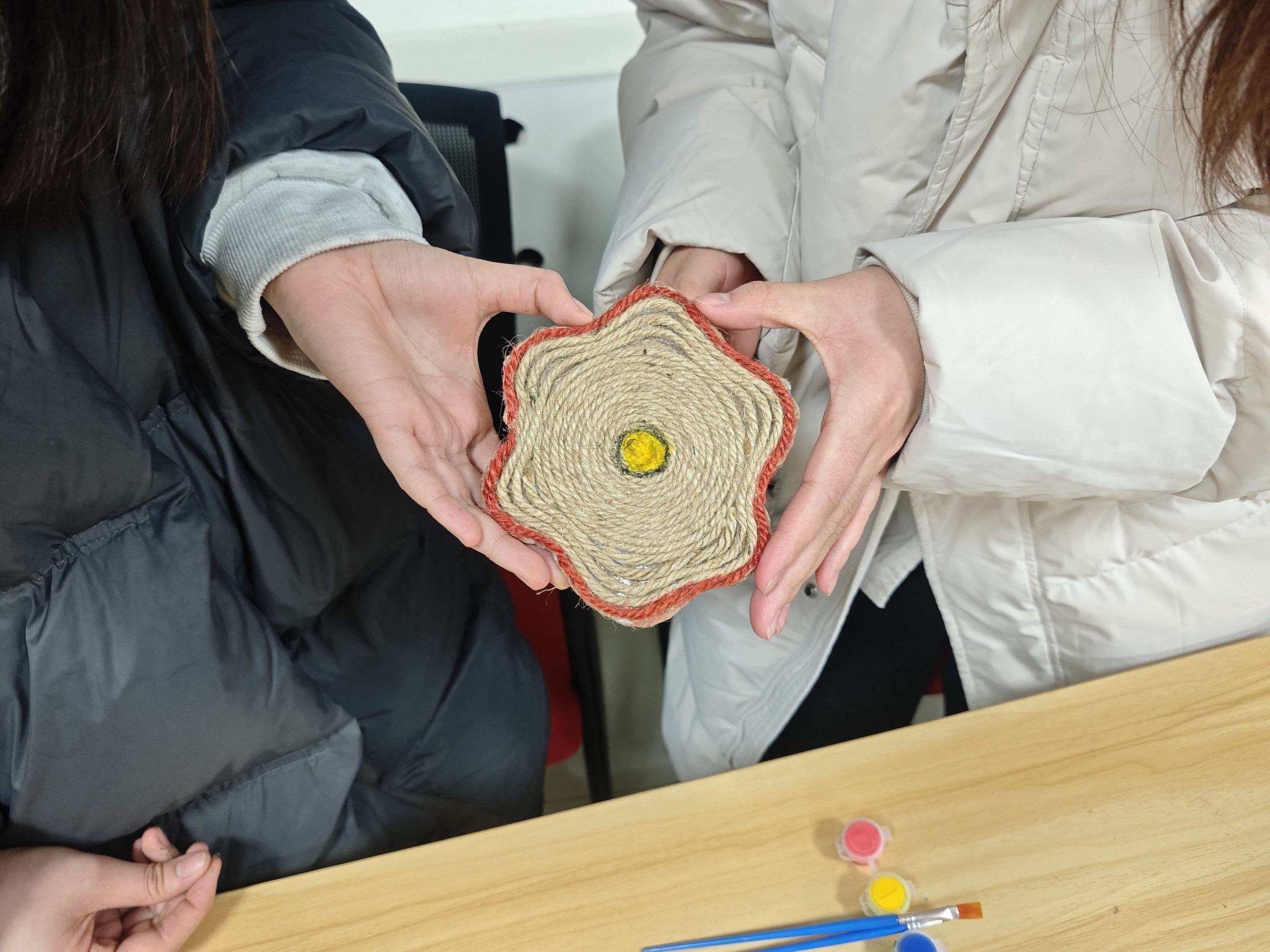 隨后,手工小導(dǎo)師張博現(xiàn)場(chǎng)演示了以舊紙盒、麻繩等為基礎(chǔ)制作杯墊的具體方法。同學(xué)們紛紛動(dòng)手,將提前收集的紙盒進(jìn)行裁剪、編織與裝飾。創(chuàng)作中大家各展巧思,作品形式多樣:有的將杯墊設(shè)計(jì)成乒乓球拍形狀,融運(yùn)動(dòng)情懷于環(huán)保實(shí)踐;有的以水果為靈感,為作品增添生活趣味;還有的制作出星星、時(shí)鐘等造型。每一件作品既承載著手工的溫情與創(chuàng)意,也成為綠色生活方式的生動(dòng)體現(xiàn)。