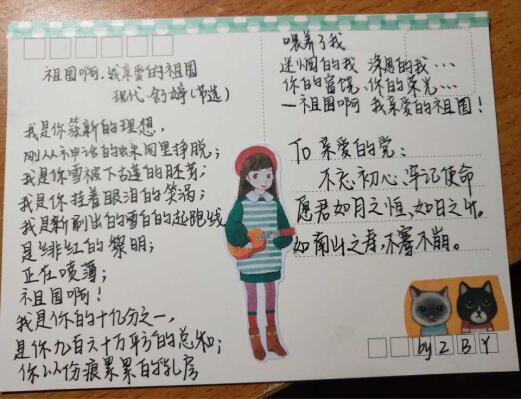 活動中,同學(xué)們發(fā)揮自己的長處,踴躍參加活動,創(chuàng)造了不同風(fēng)格的作品,有古風(fēng)、卡通、詩文等,同學(xué)們的作品體現(xiàn)出了他們的感恩之情。"親愛的祖國愿您如月之永恒,如日之升";"我是你嶄新的理想,我是你雪被下古蓮的胚芽";"祖國啊,我是你的十億分之一,是你九萬六十萬平方的總和。"......
