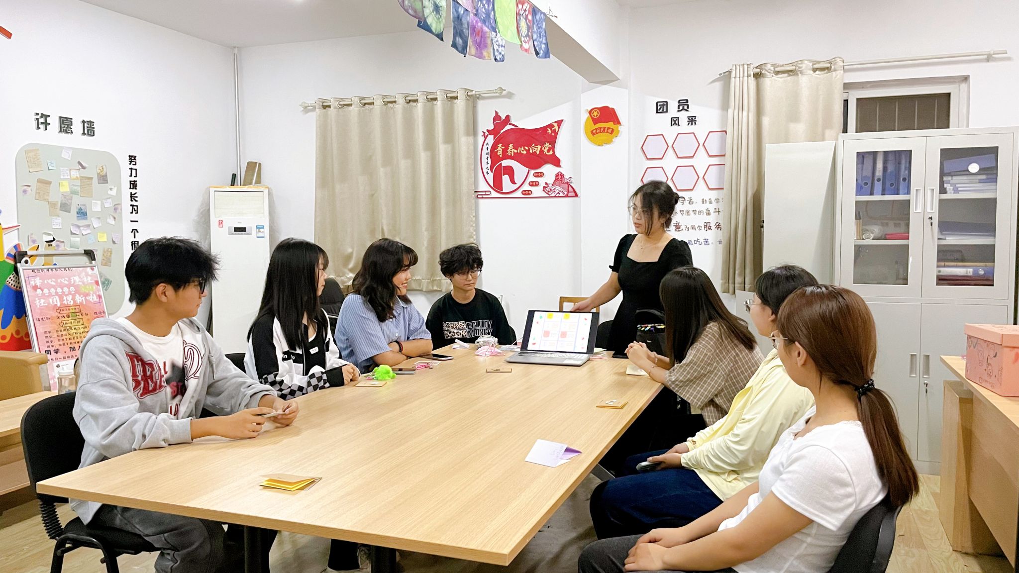 本次活動圍繞“MBTI”這一主題展開。首先,劉曉蕊帶領(lǐng)大家現(xiàn)場學(xué)習(xí)了MBTI的十六種性格類型。接著,大家對照自己的實(shí)際情況,找到自己所屬的性格類型,逐一向大家分享了自己性格特點(diǎn),大家圍繞這一主題展開了熱烈的討論,增進(jìn)了彼此之間的了解。隨后,大家在小紙片上繪制了自己想象中的卡通形象,并標(biāo)注上自己的MBTI類型或添加其他想表達(dá)的內(nèi)容進(jìn)行展示,分享創(chuàng)作背后的想法和寓意,現(xiàn)場氣氛活躍而溫馨。最后,進(jìn)入解憂環(huán)節(jié),大家將自己的煩惱和憂愁寫在紙上,折好后投入解憂箱中,每個人隨機(jī)抽取一張紙條,并依次讀出紙條上的煩惱,提出自己的解決建議或看法,群策群力幫助大家釋放了內(nèi)心的壓力。