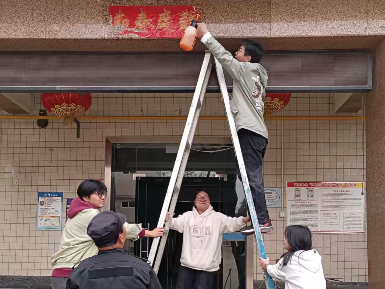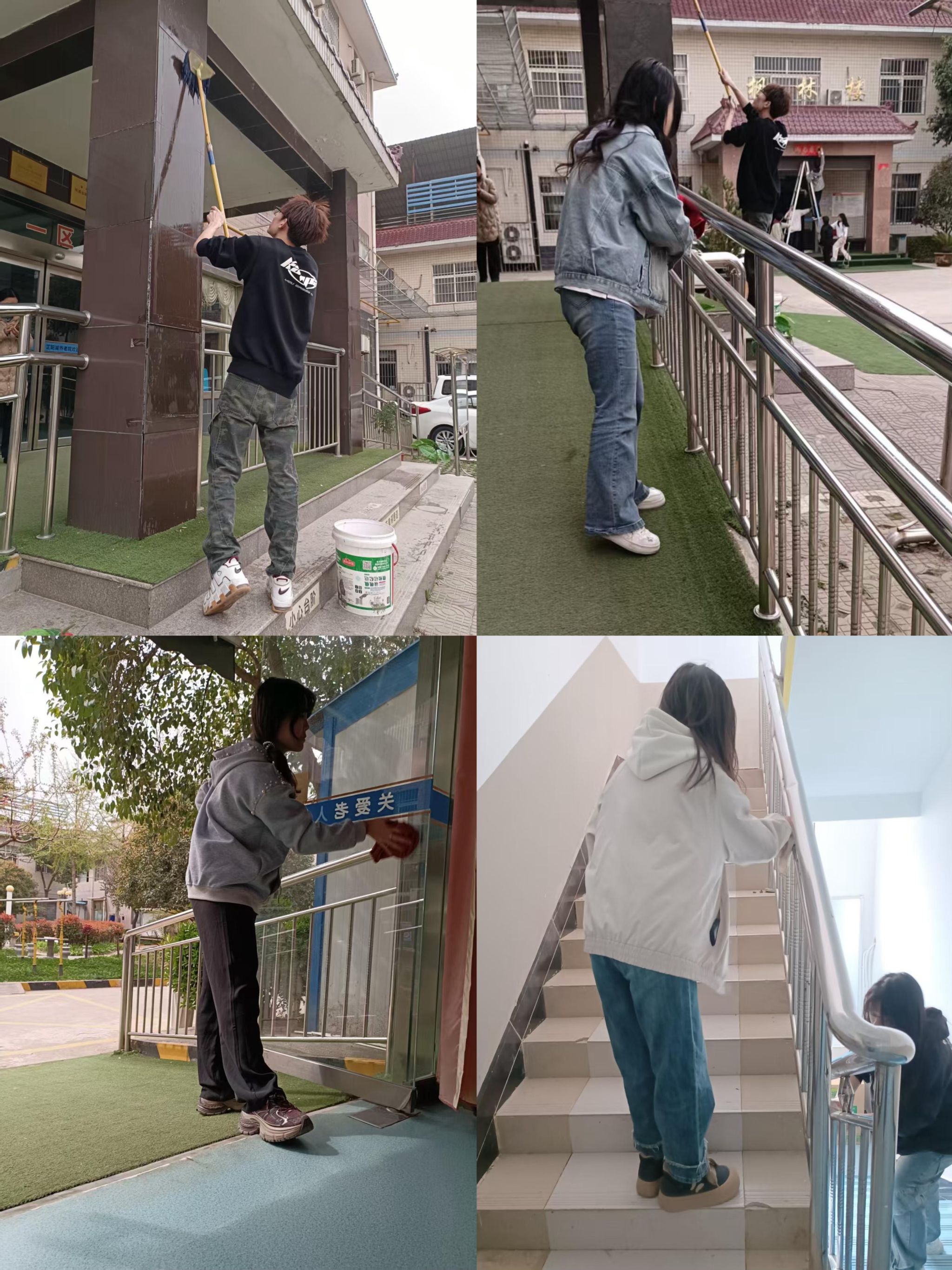 抵達(dá)養(yǎng)老院后,同學(xué)們立即投入環(huán)境清潔工作,手持清潔工具對(duì)庭院進(jìn)行全方位打掃。從修剪灌木枝葉到清理步道積水,從擦拭玻璃門(mén)窗到整理公共區(qū)域,同學(xué)們以細(xì)致入微的勞動(dòng)為老人打造整潔舒適的生活環(huán)境。
