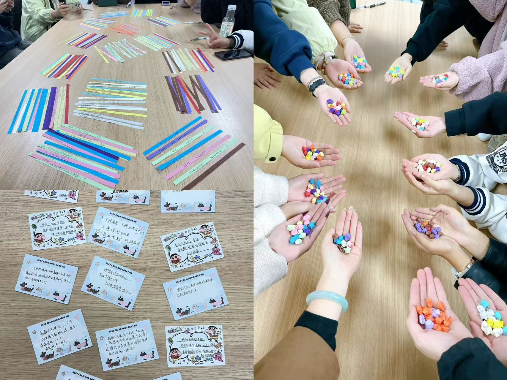 隨后,活動進(jìn)入“手寫祝福,巧手成星”的環(huán)節(jié)。同學(xué)們在星星紙上認(rèn)真寫下能給予他人力量的語句,再將每一張紙條輕輕折疊成一顆顆飽含心意的星星。這些親手制作的星星不僅是文字的載體,更是溫暖的具象表達(dá)。