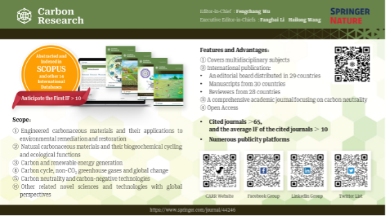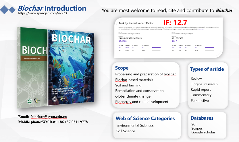 《Biochar》是《Carbon Research》姊妹期刊,是由沈陽(yáng)農(nóng)業(yè)大學(xué)主理并與施普林格·天然團(tuán)體協(xié)作出書(shū)的全英文季刊,于2019年3月創(chuàng)刊,是環(huán)球第一本生物炭范疇期刊。目前是中國(guó)科學(xué)院期刊分區(qū)一區(qū),影響因子12.7。《Carbon Research》是由廣東省科學(xué)院生態(tài)環(huán)境與土壤研究所主辦的國(guó)際全英文季刊,于2022年6月18日創(chuàng)刊正式登陸Springer Nature集團(tuán)在線平臺(tái),于2022年3月17號(hào)正式開(kāi)放投審稿系統(tǒng),目前以開(kāi)放獲取模式出版。武占省教授是這兩個(gè)期刊青年編委,歡迎廣大師生投稿、檢索閱讀。