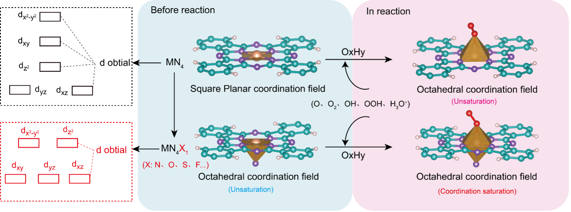 近日,我院武占省教授團隊在國際知名期刊Chemical Engineering Journal(SCI一區(qū),IF=15.1)上發(fā)表題為“Tuning the coordination field configuration on well-definedmolecular catalysts for boosting bifunctional oxygenelectrocatalytic”的研究型文章。作者通過一種非熱解策略在鐵基共軛酞菁框架(Fe-CPF)上構建軸向配位,得到具有明確Fe-N5活性中心的雙功能氧電催化劑。實驗研究和理論計算表明,軸向相互作用可使局部晶體場和自旋極化變化,即由中自旋態(tài)的平面配位(Fe-N4SP)向低自旋態(tài)的準八面體配位(Fe-N5OCquasi)轉(zhuǎn)變。dz2、dxz和dyz軌道中自旋向上和自旋向下的電子數(shù)趨于一致,自旋極化的局域?qū)ΨQ性可以使含氧反應中間體產(chǎn)生適中的吸附/解吸能,從而增強了本征反應活性。結果表明Fe-CPF@Ip-RGO表現(xiàn)出了優(yōu)異的雙功能氧催化活性(ΔE[Ej10-E1/2] = 0.567 V),超過了基準Pt/C-IrO2。這項工作為通過調(diào)控金屬活性中心的d-軌道能級分裂形式用于提高氧電催化性能提供了新的理解。