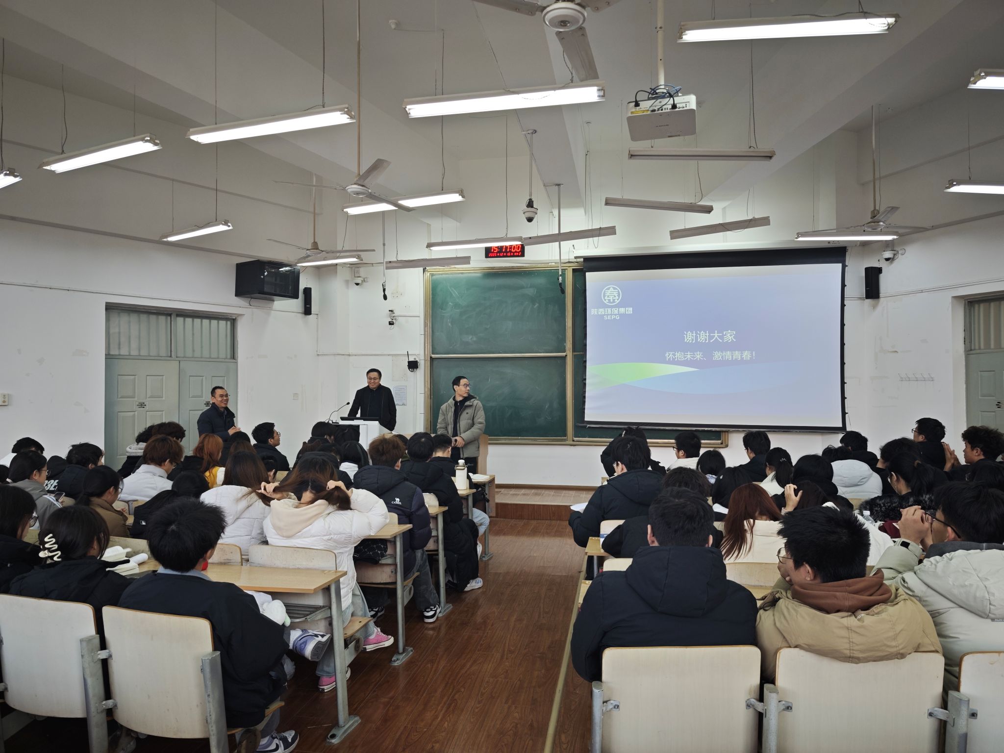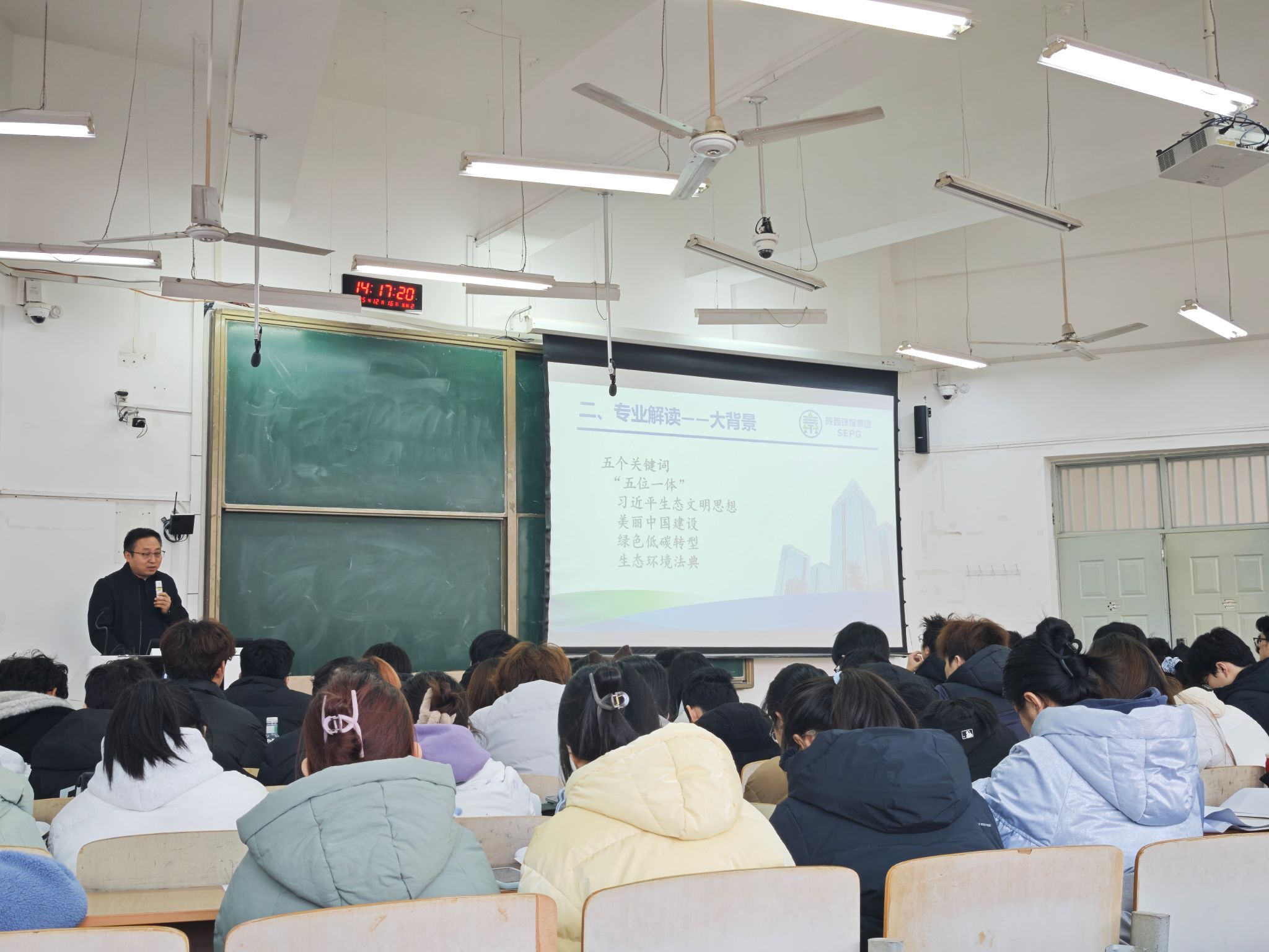 報(bào)告中,郭治敏校友以“談?wù)勅松薄皩I(yè)解讀”“一點(diǎn)建議”為主線,結(jié)合個(gè)人成長經(jīng)歷與行業(yè)洞察展開分享。在“談?wù)勅松辈糠郑銊?lì)學(xué)子樹立遠(yuǎn)大理想、保持奮斗熱情,以堅(jiān)定步伐邁向人生目標(biāo)。“專業(yè)解讀”環(huán)節(jié),郭治敏立足國家政策與行業(yè)趨勢(shì),系統(tǒng)剖析環(huán)境工程專業(yè)的發(fā)展前景,將環(huán)保領(lǐng)域歸納為污染治理、環(huán)境質(zhì)量改善與協(xié)同效益三大類別,并指出行業(yè)正邁向AI賦能、運(yùn)維深化與科技集約的新階段,為同學(xué)們勾勒出清晰的專業(yè)發(fā)展圖譜。在“一點(diǎn)建議”中,他強(qiáng)調(diào)青年學(xué)子應(yīng)珍惜時(shí)光、夯實(shí)專業(yè)、勇于嘗試,在探索中積累經(jīng)驗(yàn),在實(shí)踐中持續(xù)成長。